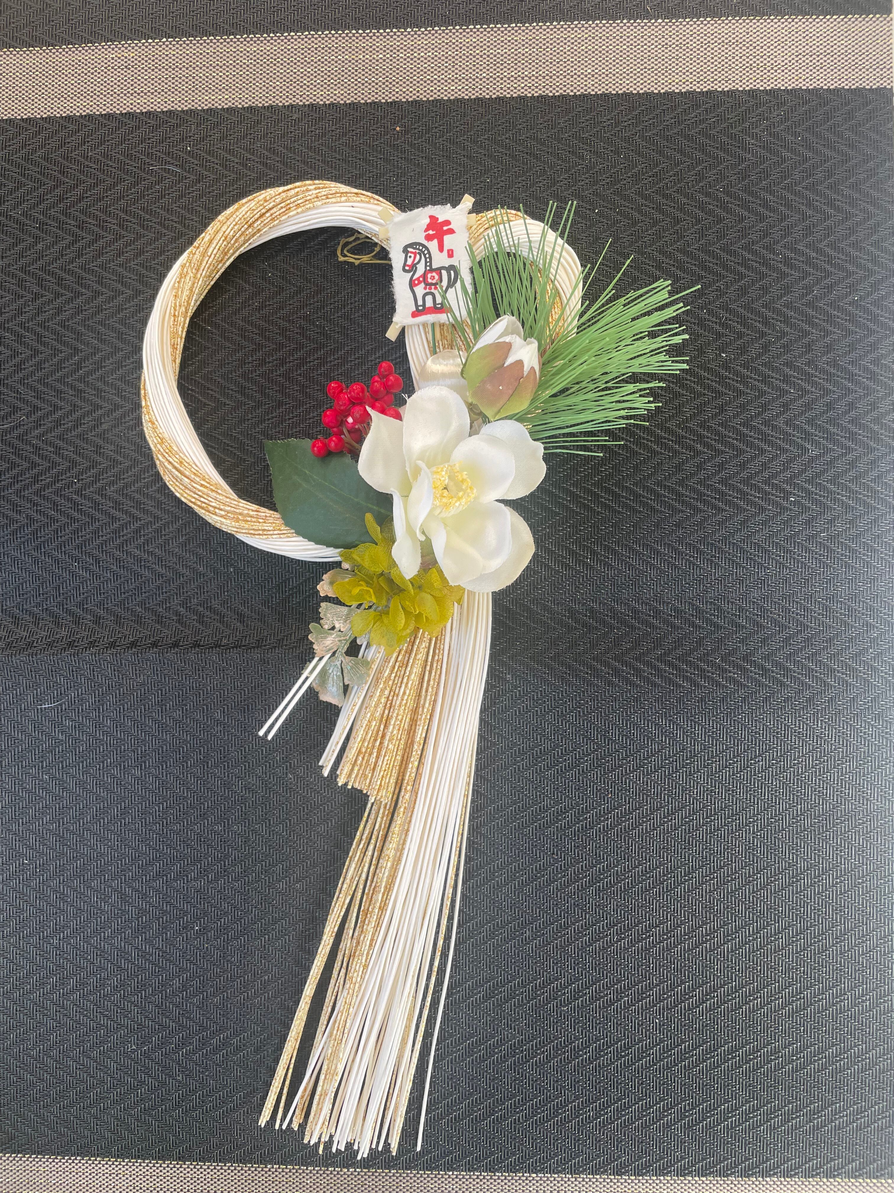 お正月飾りの白椿をあしらい